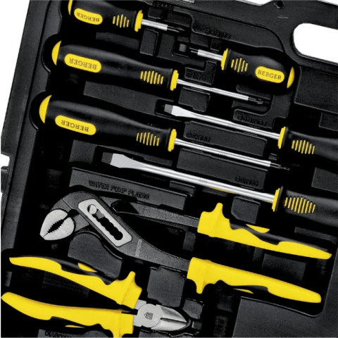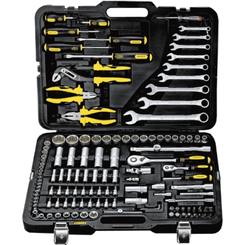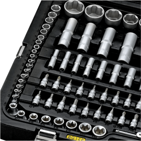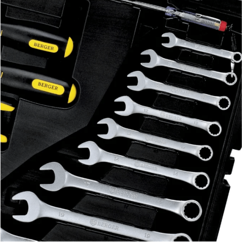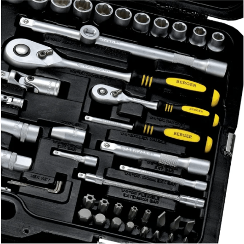 инструменты: отвёртки, вороток для головок, трещотка, пассатижи, ключи гаечные, кусачки, ключ переставной гаечный, ключи имбусовые (шестигранные), кейс в комплекте, количество торцевых головок: 76 шт.