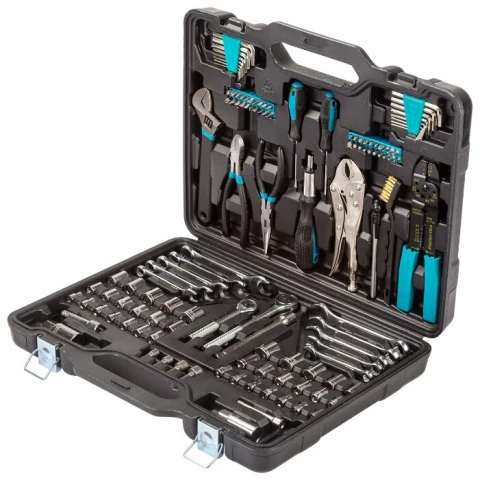 инструменты: отвёртки, рукоять для бит, вороток для головок, трещотка, круглогубцы, ключи гаечные, кусачки, ключ разводной, ключи имбусовые (шестигранные), оснастка: биты, торцевые головки, головки со вставками, аксессуары: удлинитель для головок