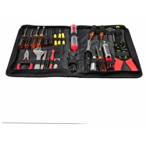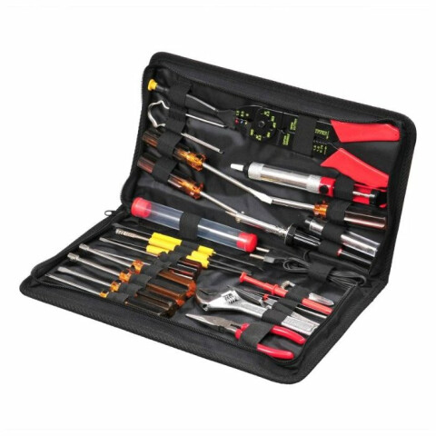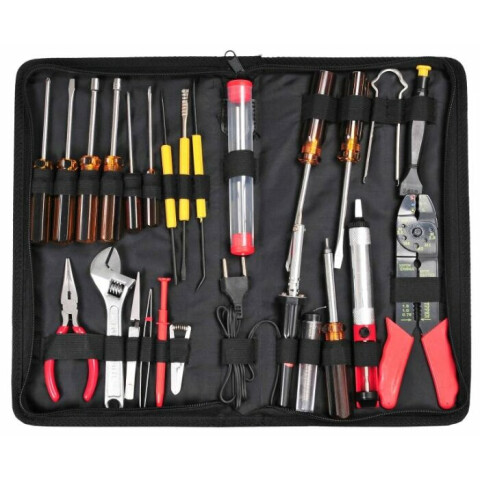 инструменты: отвёртки, рукоять для бит, пассатижи, ключ разводной, оснастка: биты, кейс (сумка) в комплекте