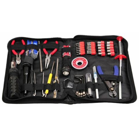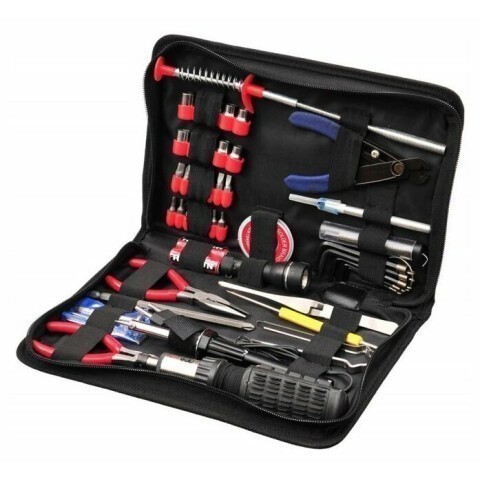 инструменты: отвёртки, рукоять для бит, пассатижи, кусачки, ключи имбусовые (шестигранные), паяльник, оснастка: биты, торцевые головки, кейс (сумка) в комплекте