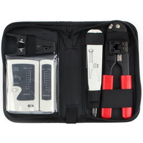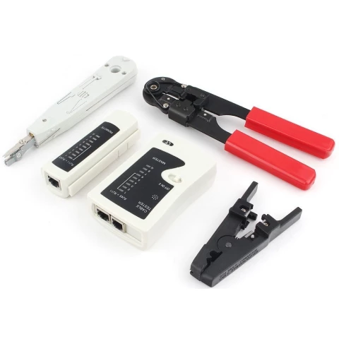 инструмент для построения локальной сети: инструмент для обрезки проводов и обжима разъемов 8P8C / RJ45, инструмент для ударного монтажа контактов, кабельный тестер (RJ45), инструмент для зачистки проводов (3.2 - 9 мм)