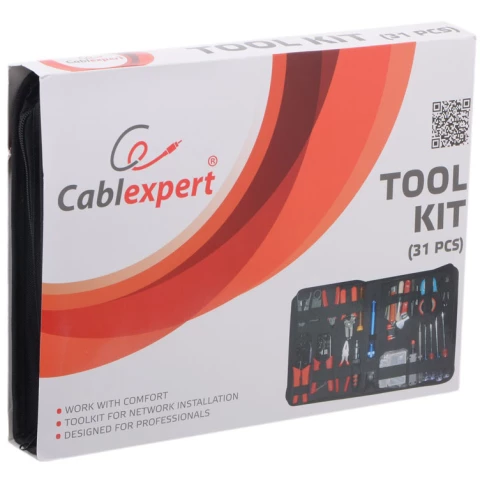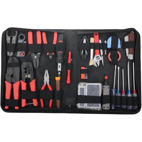 набор сетевых инструментов: клещи, устройство для зачистки кабелей, складной нож, сетевой тестер, разводной ключ, кусачки, пассатижи, обратный пинцет, отвертки, пробник фазы, изолента, рулетка