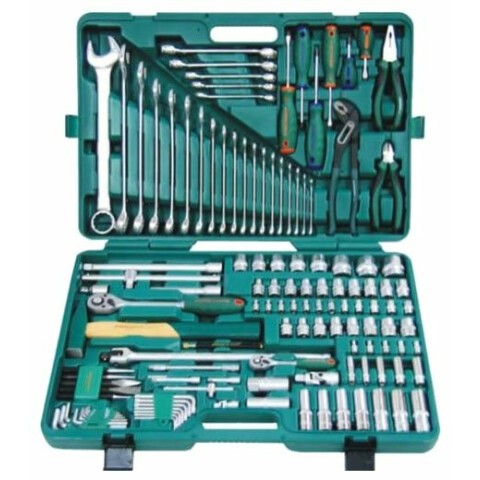набор инструментов универсальный, количество предметов: 127, отвертки, 6 шт, гаечные ключи, 19 шт, торцевые головки, 56 шт, молоток 500 г, пассатижи, кусачки, кейс в комплекте