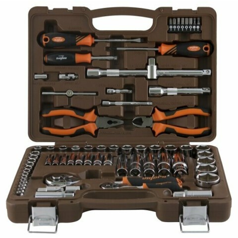 инструменты: отвёртки, рукоять для бит, трещотка, пассатижи, кусачки, оснастка: биты, торцевые головки, кейс (сумка) в комплекте, количество бит: 8 шт., количество торцевых головок: 38 шт.