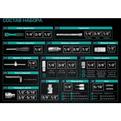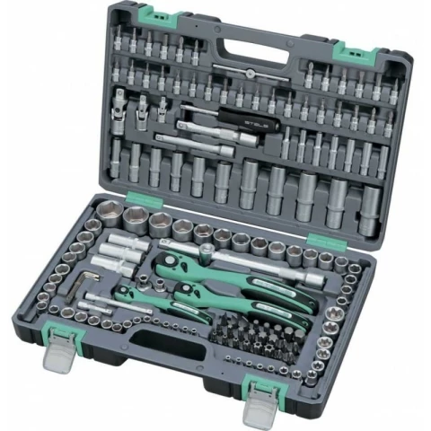 автомобильный набор инструментов, количество предметов в наборе: 151 шт, присоединительный размер: 1/2", 1/4", 3/8", размер торцевых головок: 4-32 мм, кейс