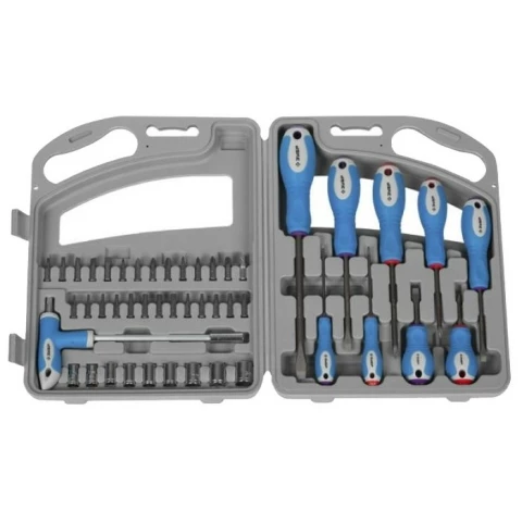 набор инструментов слесарный, количество предметов: 46, отвертки, 9 шт, биты, 27 шт, торцевые головки, 9 шт, вес 1.3 кг, кейс в комплекте