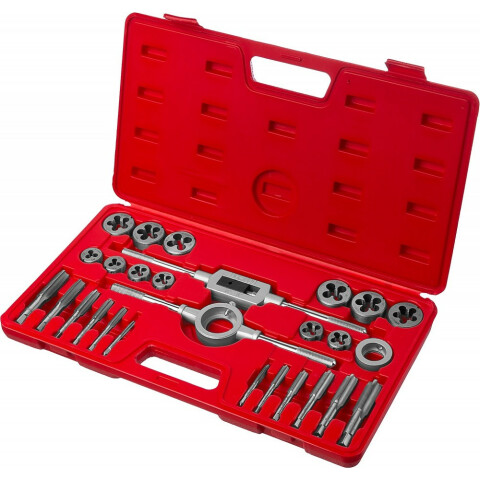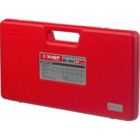 набор метчиков и плашек, метрическая резьба: М5-М16, в комплекте метчикодержатель, плашкодержатель, втулка для плашек, 12 однопроходных метчиков и 12 плашек, всего 27 предметов, подробный состав комплекта см. ниже