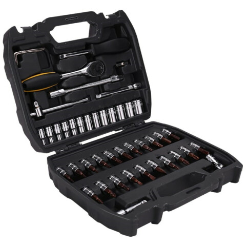 торцевые головки шестигранные, присоединительный размер: 1/4", трещоточный ключ в комплекте, биты в комплекте, удлинитель в комплекте, кардан в комплекте, кейс