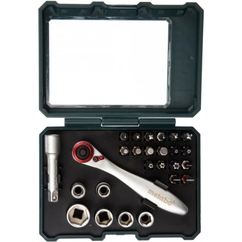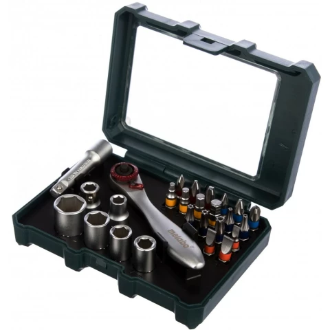 торцевые головки шестигранные, присоединительный размер: 1/4", трещоточный ключ в комплекте, биты в комплекте, удлинитель в комплекте