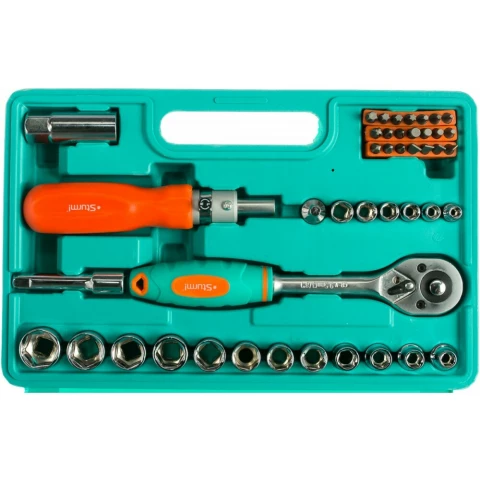 торцевые головки шестигранные, присоединительный размер: 1/4", 3/8", трещоточный ключ в комплекте, биты в комплекте, удлинитель в комплекте, кейс