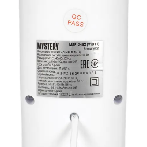 вентилятор напольный, осевой, мощность 60 Вт, поворотная система, регулировка наклона, регулировка высоты