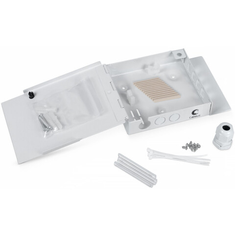 бокс оптический настенный на 4 SC (LC duplex) со сплайс пластиной и КДЗС (без пигтейлов и проходных адаптеров), тип адаптера: SC/2xLC, максимальное количество оптических волокон: 4 (8 для duplex LC)