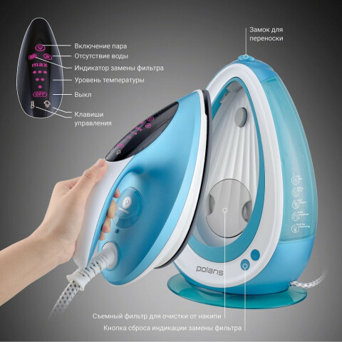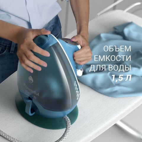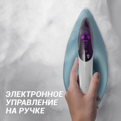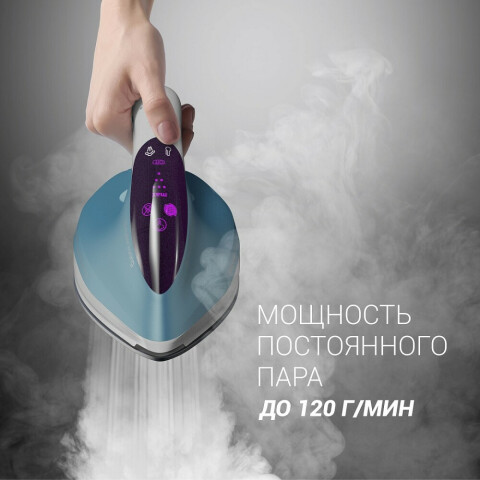 мощность: 2400 Вт, расход при постоянной подаче пара: 120 г/мин, максимальное давление пара: 6.5 бар, объём резервуара для воды: 1500 мл, подошва: керамика (PRO 5 Ceramic)