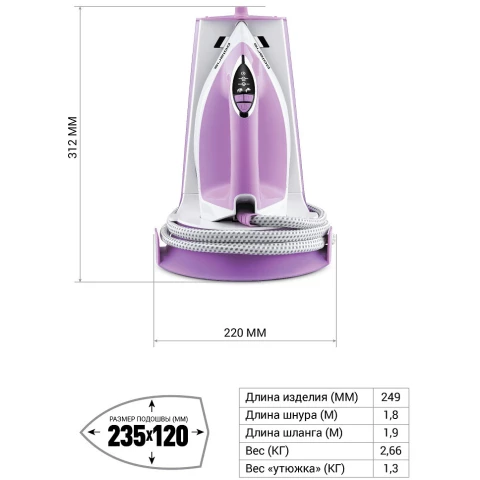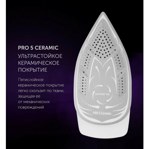 Бренд: Polarisмощность: 3000 Вт, расход при постоянной подаче пара: 120 г/мин, расход при паровом ударе: 400 г/мин, максимальное давление пара: 7 бар, объём резервуара для воды: 1500 мл, подошва: керамика (PRO 5 Ceramic)