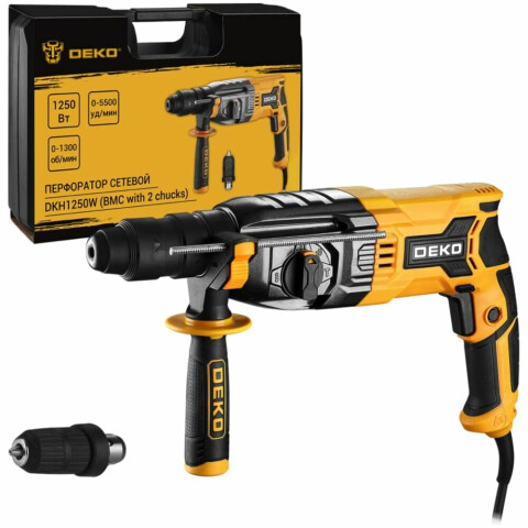 Бренд: DEKOмощность 1250 Вт, питание от сети, патрон SDS-Plus, 5500 уд/мин, энергия удара 3.2 Дж, кейс