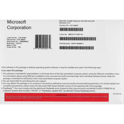 ПО Microsoft Windows 10 Professional 64-bit English 1pk DSP OEI DVD (FQC-08930)
