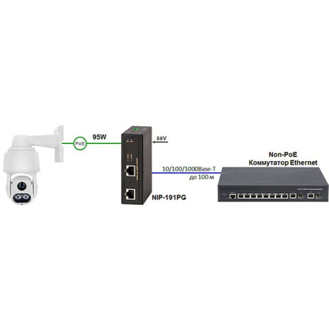 PoE-инжектор высокой мощности, 10/100/1000 Мбит/с, макс. мощность порта: 95 Вт, БП 48-56VDC, -40°C ... +75°C