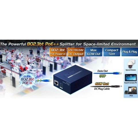 PoE сплиттер, 1 порт 10/100/1000 Мбит/с 802.3bt PoE++, DIP-переключатель 12V/19/24V, выходная мощность до 60 Вт, пассивное подключение Ethernet до 100 м