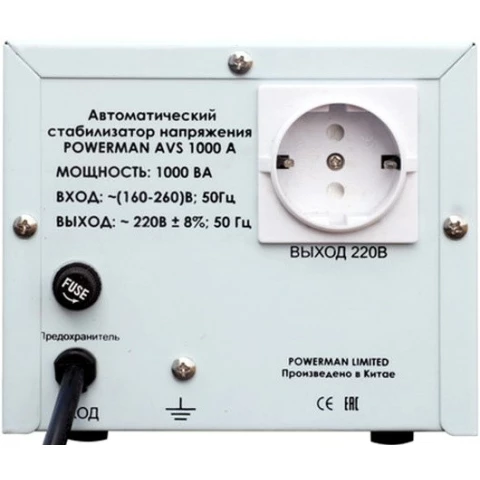 стабилизатор напряжения, релейный, мощность 1кВ, входное напряжение: 160~260В, выходное напряжение: 202~238В, евророзетка, точность стабилизации 8%, цифровая индикация, синусоида без искажений, защита IP20