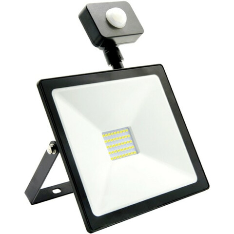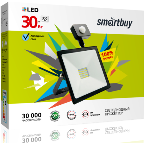 Бренд: SmartBuyпрожектор на дуге крепления, источник света: светодиоды, мощность 30 Вт, холодный белый цвет, цветовая температура 6500 K, световой поток 2400 Лм, до 30000 ч работы, датчик движения, IP65