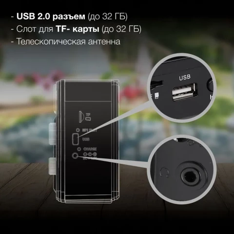 переносной радиоприёмник, приём FM, СВ, AM, аналоговая настройка частоты, 6 Вт, поддержка USB, microSD, питание: 2xD
