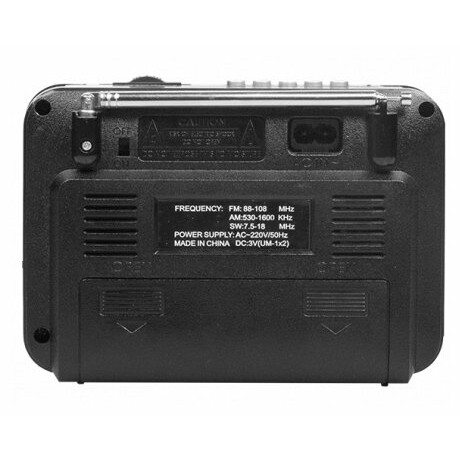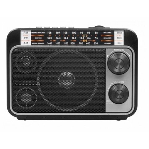 переносной радиоприёмник, приём FM, КВ, СВ, аналоговая настройка частоты, разъём для наушников, поддержка SD, USB, питание: 2xD