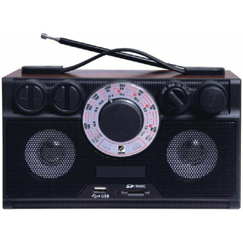 переносной радиоприёмник, приём FM, КВ, СВ, УКВ, аналоговая настройка частоты, разъём для наушников, поддержка SD, USB