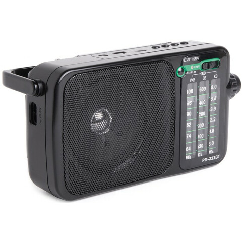 переносной радиоприёмник, приём КВ, СВ, УКВ, аналоговая настройка частоты, 5 Вт, разъём для наушников, поддержка SD, USB, питание: 2xD