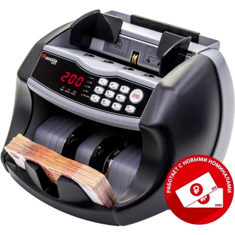 счётчик банкнот, скорость счёта: 1000 банкнот/мин, ёмкость накопителя: 400 банкнот, ёмкость приемного лотка: 300 банкнот, тип детекции: УФ/по размеру/магнитный, работает с купюрами новых номиналов 200 и 2000 руб
