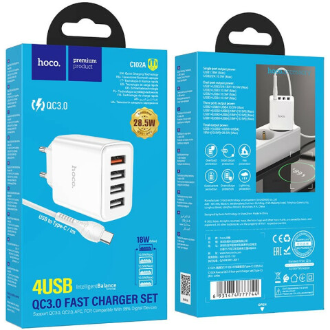 сетевое зарядное устройство, мощность 28.5 Вт, 4x USB, быстрая зарядка, кабель USB Type-C