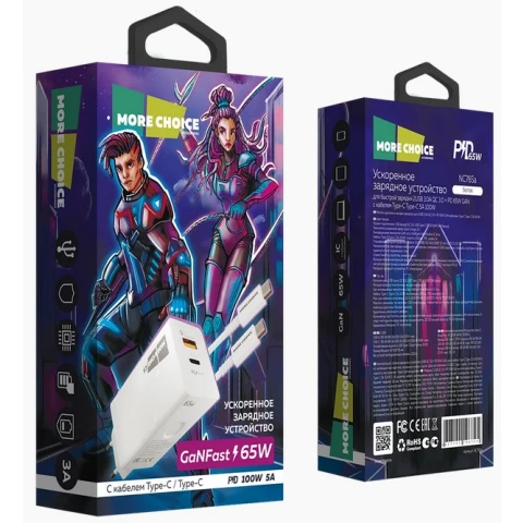 Бренд: More Choiceсетевое зарядное устройство, мощность 65 Вт, сила тока 3 A, 1x USB, 1x USB Type-C, быстрая зарядка