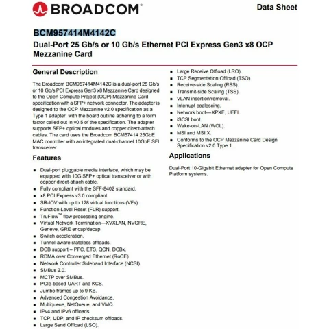 сетевой адаптер Mezzanine, интерфейс: PCI Express 3.0 x8, контроллер Broadcom BCM57414, два порта 25GbE SFP28, скорость передачи данных: 10/25 Гб/с