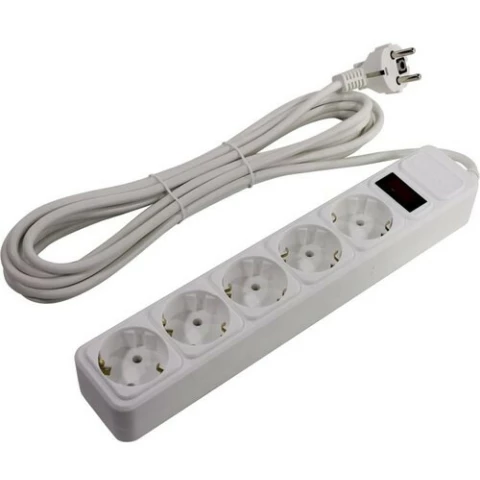сетевой фильтр, 5 розеток, макс. нагрузка 2200 Вт, макс. ток 10 А, заземление, выключатель на корпусе, длина кабеля: 5 м, белый