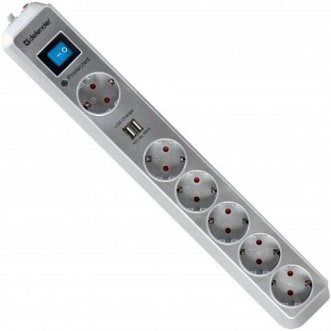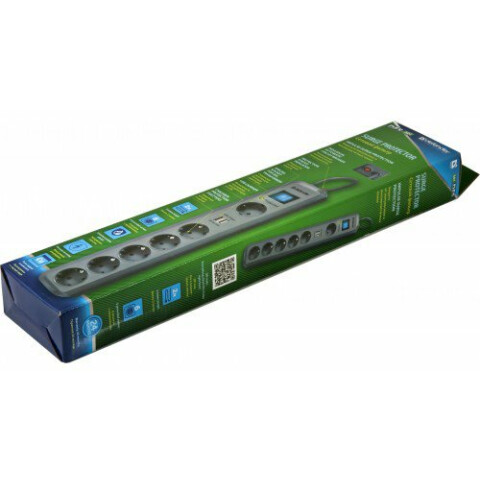 сетевой фильтр с защитой цепи фаза-ноль,фаза-земля, ноль-земля, 6 евророзеток (с заземлением), 2 x USB, максимальная мощность нагрузки: 2200 Вт, макс. рассеиваемая энергия: 525 Дж, кабель 2м, серый