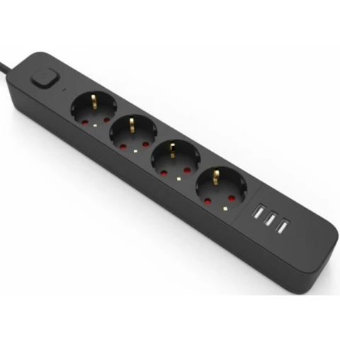 сетевой фильтр, 4 розетки, макс. ток 10 А, USB, заземление, выключатель на корпусе, шторки на розетке, длина кабеля: 2 м, чёрный