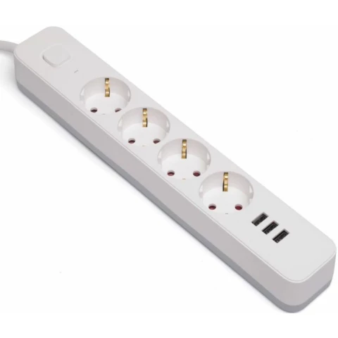сетевой фильтр, 4 розетки, макс. ток 10 А, USB, заземление, выключатель на корпусе, шторки на розетке, длина кабеля: 2 м, белый