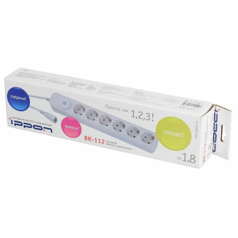 сетевой фильтр, 6 розеток, макс. нагрузка 2200 Вт, заземление, выключатель на корпусе, длина кабеля: 1.8 м, белый