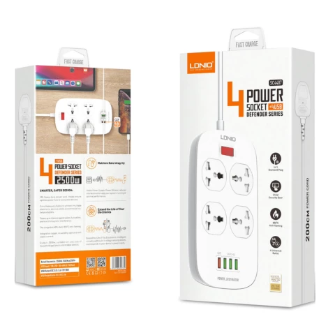 сетевой фильтр, 4 розетки, макс. нагрузка 2500 Вт, макс. ток 10 А, USB, заземление, выключатель на корпусе, шторки на розетке, длина кабеля: 2 м, белый