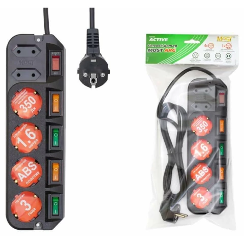 Бренд: Mostсетевой фильтр, 6 розеток, макс. нагрузка 2200 Вт, заземление, выключатель на корпусе, длина кабеля: 1.6 м, чёрный