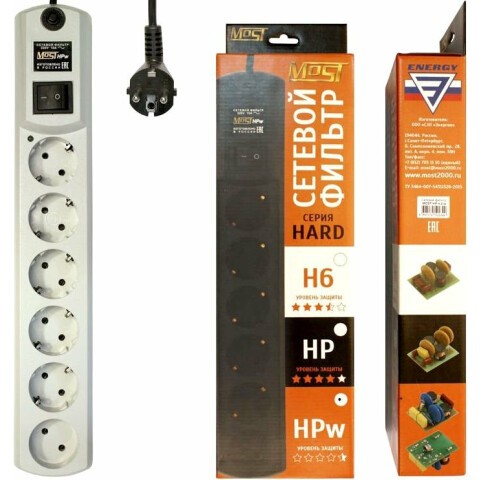 Бренд: Mostсетевой фильтр, 6 розеток, макс. нагрузка 2200 Вт, заземление, выключатель на корпусе, длина кабеля: 5 м, белый