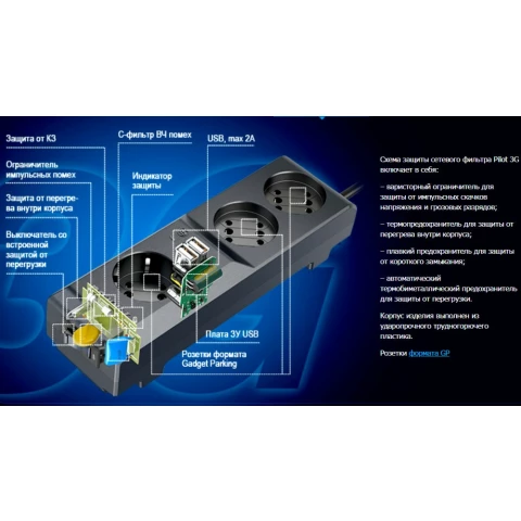 | сетевой фильтр, 3 розетки, макс. нагрузка 2200 Вт, макс. ток 10 А, USB, выключатель на корпусе, длина кабеля: 7 м, чёрный | 740 смн. |