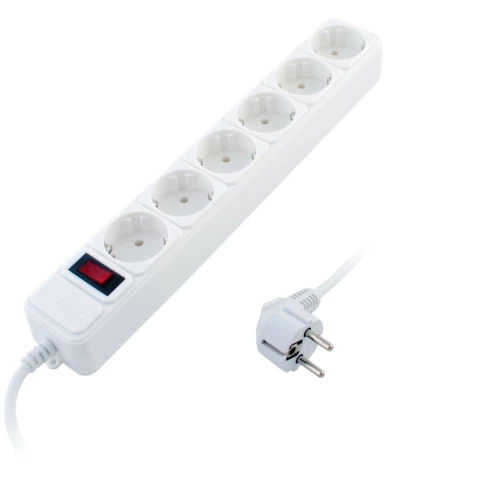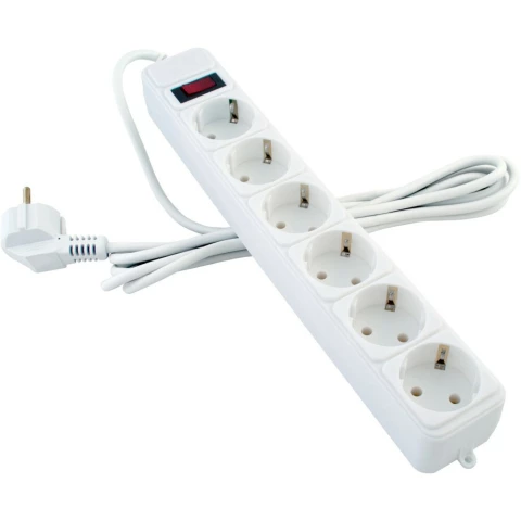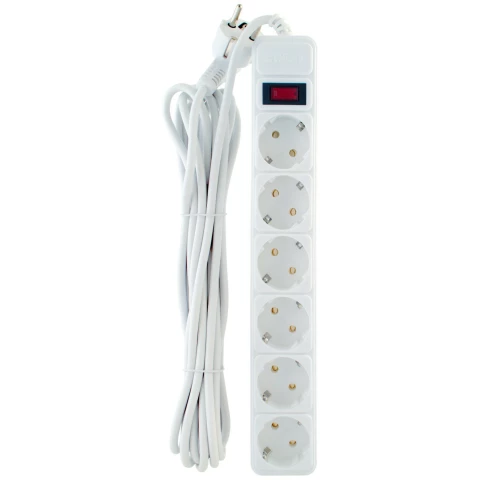 сетевой фильтр, 6 розеток, макс. нагрузка 2200 Вт, макс. ток 10 А, заземление, выключатель на корпусе, шторки на розетке, длина кабеля: 5 м, белый