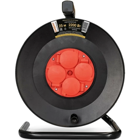 удлинитель, 4 розетки, макс. нагрузка 2200 Вт, макс. ток 10 А, выключатель на корпусе, заземление, шторки на розетке, длина кабеля: 25 м, красный, чёрный