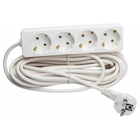 удлинитель, 4 розетки, макс. нагрузка 2200 Вт, макс. ток 10 А, заземление, длина кабеля: 10 м, белый