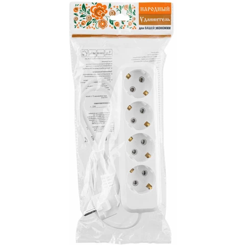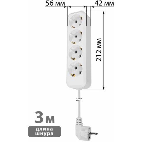 удлинитель, 4 розетки, макс. нагрузка 3680 Вт, макс. ток 16 А, заземление, шторки на розетке, длина кабеля: 3 м, белый