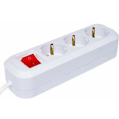 удлинитель, 3 розетки, макс. нагрузка 3000 Вт, макс. ток 13 А, заземление, выключатель на корпусе, длина кабеля: 5 м, белый