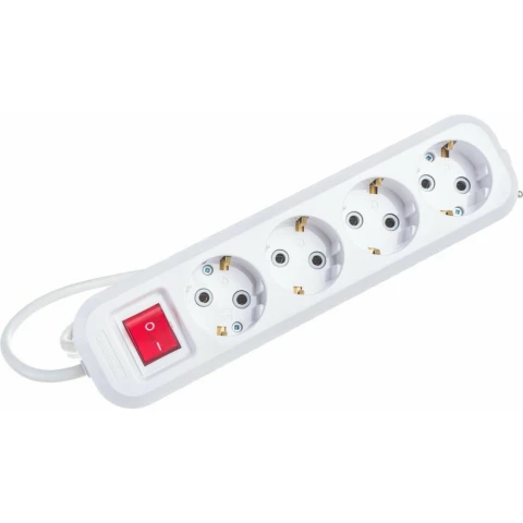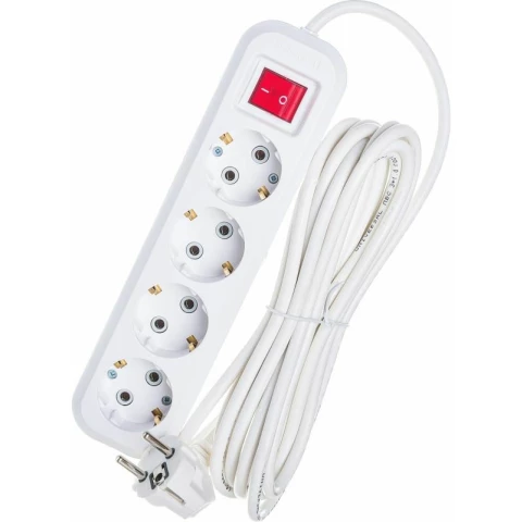 удлинитель, 4 розетки, макс. нагрузка 3000 Вт, макс. ток 13 А, заземление, выключатель на корпусе, длина кабеля: 5 м, белый