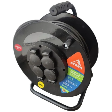 удлинитель, 4 розетки, макс. нагрузка 3500 Вт, макс. ток 16 А, заземление, длина кабеля: 30 м, чёрный