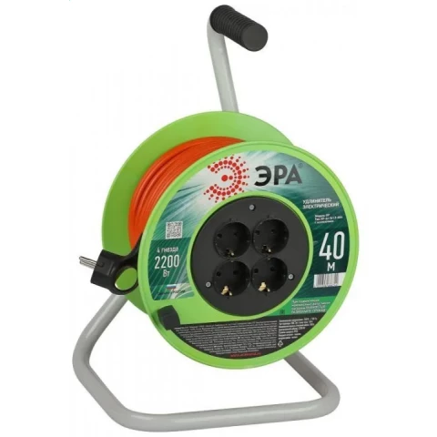Бренд: ЭРАудлинитель, 4 розетки, макс. нагрузка 2200 Вт, макс. ток 10 А, заземление, длина кабеля: 40 м, оранжевый, зелёный