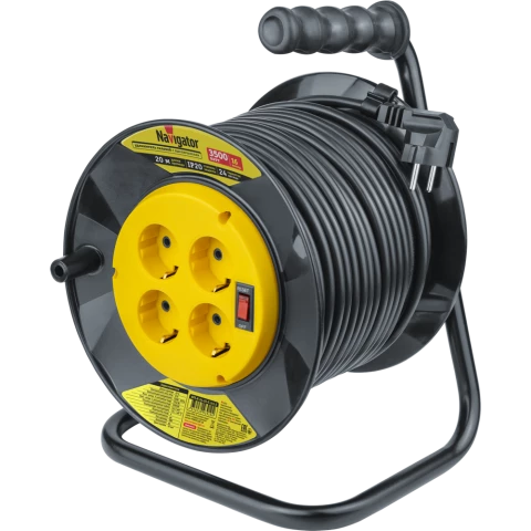 Бренд: Navigatorудлинитель, 4 розетки, макс. нагрузка 3500 Вт, макс. ток 16 А, заземление, выключатель на корпусе, длина кабеля: 20 м, чёрный, жёлтый